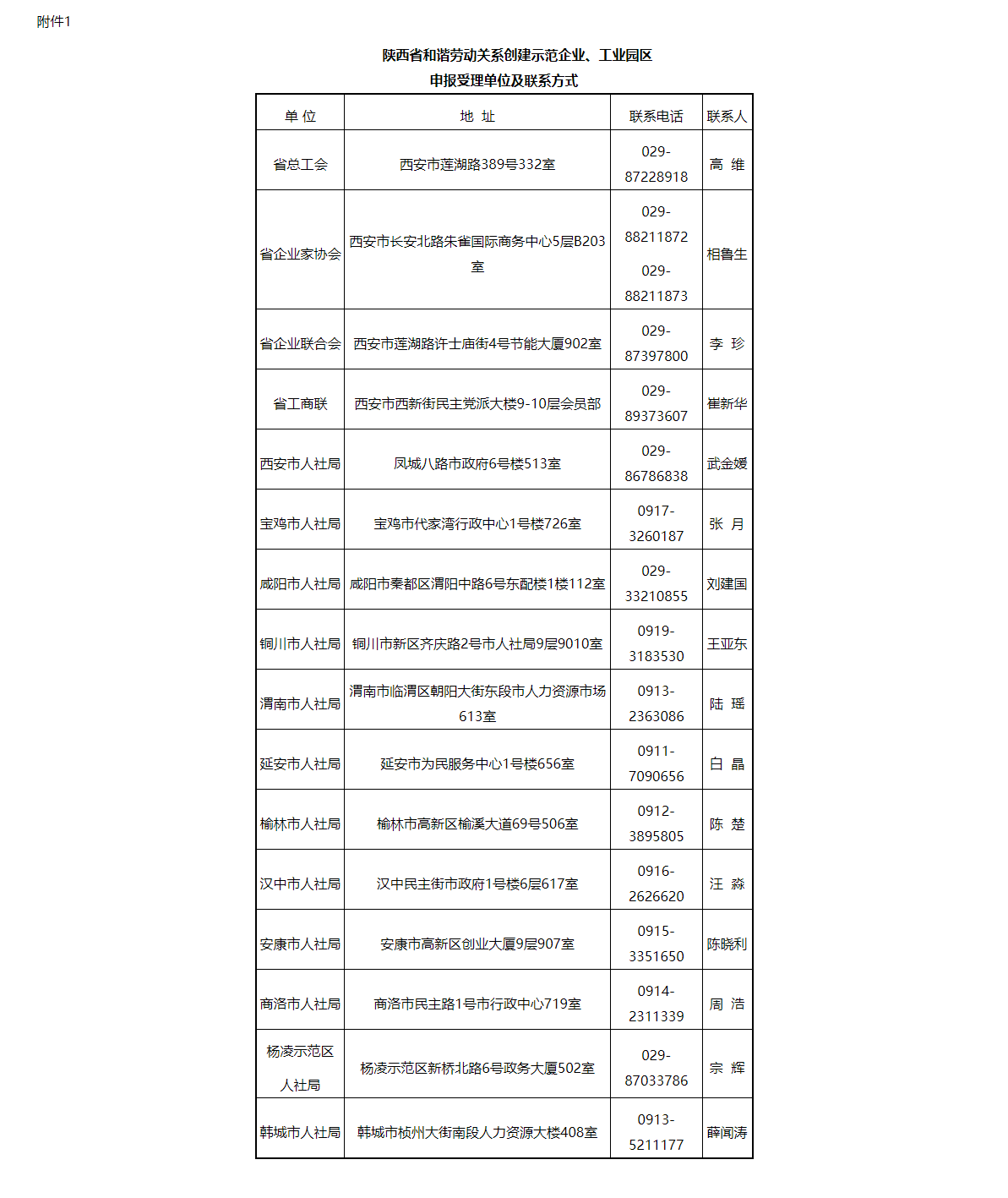 為推動和諧勞動關系創(chuàng)建活動深入開展,構建中國特色和諧勞動關系,省協(xié)調(diào)勞動關系三方委員會辦公室決定,開展2024年陜西省和諧勞動關系創(chuàng)建示范活動?,F(xiàn)將有關事項通知如下: 一、總體要求 以習近平新時代中國特色社會主義思想為指導,深入貫徹黨的二十大精神,完整、準確、全面貫徹新發(fā)展理念,加快構建新發(fā)展格局,著力推動高質(zhì)量發(fā)展,全面落實黨中央、國務院關于構建和諧勞動關系的重要決策部署,通過認定示范企業(yè)、工業(yè)園區(qū),充分展現(xiàn)構建中國特色和諧勞動關系取得的重要成就,大力弘揚企業(yè)自覺踐行社會責任的新時代精神,厚植企業(yè)關心關愛職工、職工愛崗愛企的和諧文化底蘊,更好發(fā)揮先進典型的示范引領作用,帶動企業(yè)切實保障職工權益,引導職工增強對企業(yè)的責任感、認同感和歸屬感,充分調(diào)動勞動關系主體雙方的積極性、主動性、創(chuàng)造性,打造企業(yè)與職工的利益共同體、事業(yè)共同體、命運共同體,團結動員廣大企業(yè)和職工建功立業(yè)新時代,推動形成企業(yè)得效益、職工得實惠、經(jīng)濟得發(fā)展、社會得穩(wěn)定、和合文化得弘揚的良好局面。 二、范圍和命名方式 (一)創(chuàng)建范圍 全省各類企業(yè)、工業(yè)園區(qū)(包括各類經(jīng)濟技術開發(fā)區(qū)、高新技術產(chǎn)業(yè)園區(qū)、科技園區(qū)以及其他產(chǎn)業(yè)集聚區(qū))。 已經(jīng)評選為陜西省勞動關系和諧企業(yè)、工業(yè)園區(qū)的不再參評。 (二)項目設置和名額 陜西省和諧勞動關系創(chuàng)建示范企業(yè)、工業(yè)園區(qū)50個。 (三)命名方式 入選企業(yè)命名“陜西省和諧勞動關系創(chuàng)建示范企業(yè)”,入選工業(yè)園區(qū)命名“陜西省和諧勞動關系創(chuàng)建示范工業(yè)園區(qū)”,同時頒發(fā)銘牌。 對和諧勞動關系創(chuàng)建示范活動中表現(xiàn)突出的各市(區(qū))、縣(市、區(qū))協(xié)調(diào)勞動關系三方成員單位予以通報表揚。 三、創(chuàng)建示范原則 創(chuàng)建示范活動堅持公平、公正、公開;堅持嚴格執(zhí)行創(chuàng)建示范標準和“兩審三公示”程序;堅持三方共同審核。 四、組織實施 (一)開展企業(yè)勞動用工體檢(3月25日-4月30日) 市縣協(xié)調(diào)勞動關系三方辦公室、省協(xié)調(diào)勞動關系三方各成員單位按照陜西省和諧勞動關系創(chuàng)建示范企業(yè)評價標準,組織相關企業(yè)開展勞動用工體檢活動,查找企業(yè)存在的短板和差距,幫助企業(yè)提出針對性的改進措施,提升企業(yè)勞動用工管理水平。各級人社部門結合“人社工作進園區(qū)”活動,廣泛宣傳陜西省和諧勞動關系創(chuàng)建示范工業(yè)園區(qū)評價標準,“一對一”“手把手”指導工業(yè)園區(qū)開展和諧勞動關系工業(yè)園區(qū)創(chuàng)建。 (二)企業(yè)和工業(yè)園區(qū)自評(5月6日-5月20日) 各企業(yè)、工業(yè)園區(qū)自愿申報,由人資部門(管理部門)和工會協(xié)商一致,對照評價標準進行自評,自評得分達到85分及以上,并將自評情況在本單位公示5個工作日無異議的,方可申報。地方工會組織按照要求,指導企業(yè)做好勞動關系狀況的綜合滿意度調(diào)查工作。 (三)分級申報(5月21日-6月28日) 1.企業(yè)可向市縣協(xié)調(diào)勞動關系三方辦公室申報,也可向省總工會、企業(yè)家協(xié)會、企業(yè)聯(lián)合會、工商聯(lián)申報(聯(lián)系方式詳見附件1 )。 2.工業(yè)園區(qū)、先進單位按照隸屬關系,向同級協(xié)調(diào)勞動關系三方辦公室申報,各級協(xié)調(diào)勞動關系三方逐級匯總上報。 申報材料 1.陜西省和諧勞動關系創(chuàng)建示范企業(yè)、工業(yè)園區(qū)、先進單位申報表(附件2、3、4); 2.書面自評報告(附件5); 3.公示證明材料; 4.典型經(jīng)驗材料。 申報紙質(zhì)材料(一份)及電子文本于6月28日前報送相關受理單位,受理單位在“信用中國(陜西)”等信用平臺查詢企業(yè)綜合信用信息后,現(xiàn)場給出初評意見。逾期不再受理。 (四)組織考核(7月1日-8月30日) 各市(區(qū))協(xié)調(diào)勞動關系三方辦公室負責本轄區(qū)內(nèi)申報企業(yè)、工業(yè)園區(qū)、先進單位的考核工作,按評分標準逐項打分并提出考核意見。被考核企業(yè)、工業(yè)園區(qū)、先進單位應向考核組如實匯報創(chuàng)建示范活動開展情況,并按要求提供原始資料和各類臺賬。各市(區(qū))協(xié)調(diào)勞動關系三方辦公室將考核結果向社會公示5個工作日,公示無異議的,于8月30日前將考核結果及申報材料報省協(xié)調(diào)勞動關系三方委員會辦公室。 省協(xié)調(diào)勞動關系三方委員會辦公室各成員單位分別負責受理的企業(yè)考核工作,將考核結果向社會公示5個工作日,公示無異議的,于8月30日前將考核結果及申報材料報省協(xié)調(diào)勞動關系三方委員會辦公室。 省協(xié)調(diào)勞動關系三方委員會辦公室對申報的企業(yè)、工業(yè)園區(qū)、先進單位進行抽查。 (五)審議命名(9月-10月) 省協(xié)調(diào)勞動關系三方委員會辦公室將企業(yè)、工業(yè)園區(qū)和單位名單提交創(chuàng)建示范工作領導小組審議,擬定命名和通報名單,擬定名單向社會公示5個工作日。對經(jīng)公示無異議