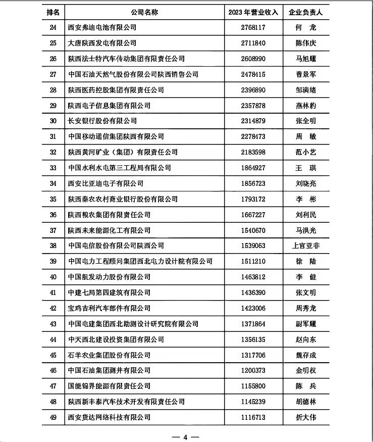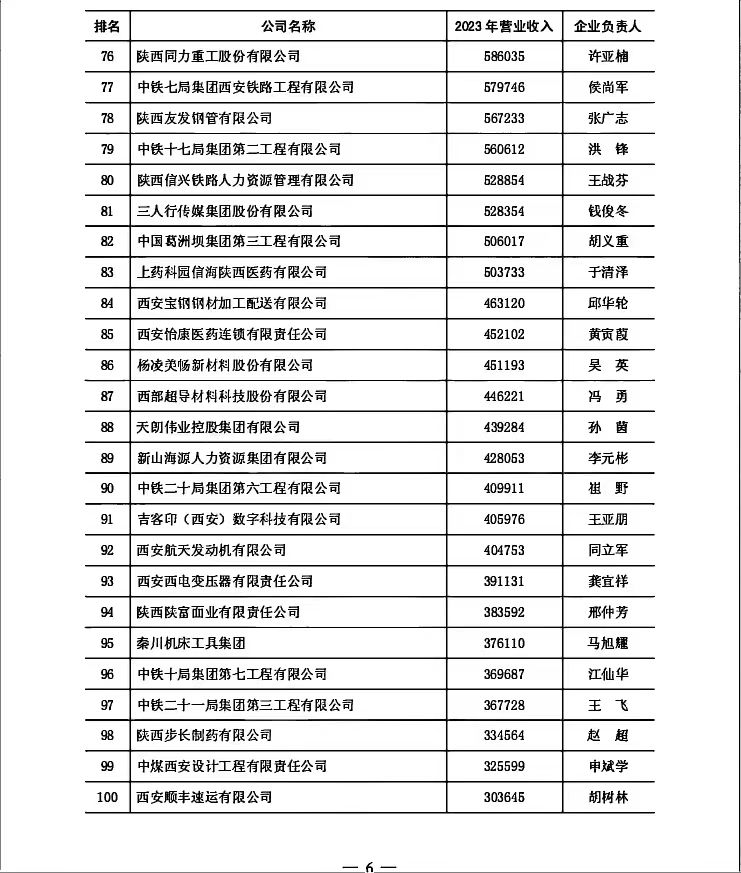 附一:2024陜西企業(yè)100強(qiáng)排序名單